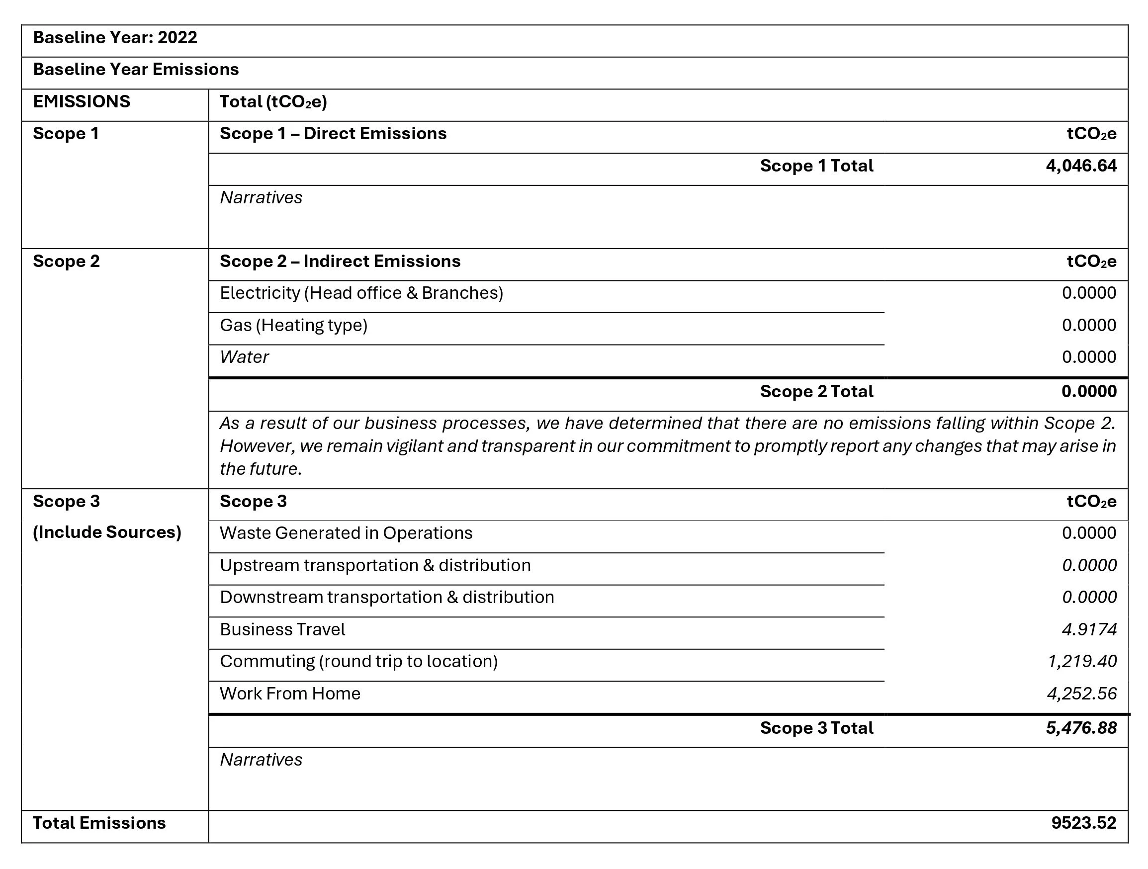 The baseline year for our carbon reduction plan is January to December 2022. During this period, we will comprehensively assess our greenhouse gas emissions across all operational aspects, including energy consumption, transportation, and waste generation. This baseline will serve as a benchmark against which we will measure our progress in reducing carbon emissions